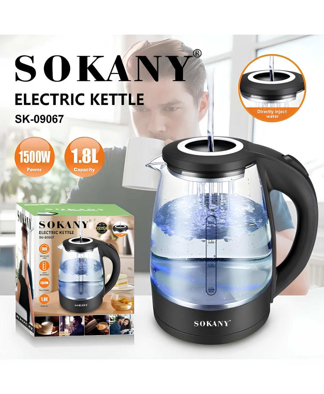 The SOKANY SK-09067 electric kettle with a volume of 1.8 liters and a power of 1500 W is a fast and convenient solution for boiling water. It quickly heats the water to the right temperature, which saves you time. The kettle is equipped with a comfortable handle, is easy to use and has a stylish design that will suit any interior. The transparent housing allows you to monitor the water level, and the overheating protection system guarantees safety. SOKANY SK-09067 is reliability, speed and comfort in your kitchen.