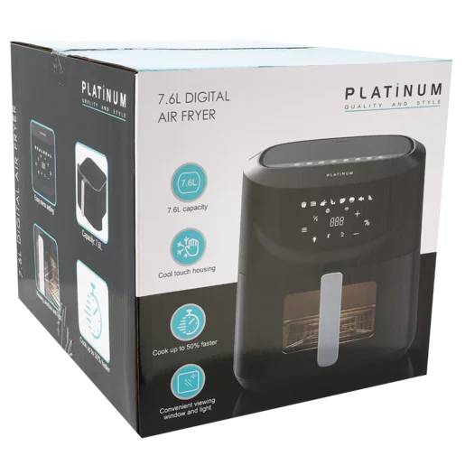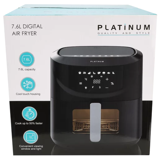Its large 7.6-liter capacity, digital display, and built-in timer make it simple to use and ideal for families and entertainers. Cleaning is also a breeze because to the nonstick surface and dishwasher-safe removable basket and tray.