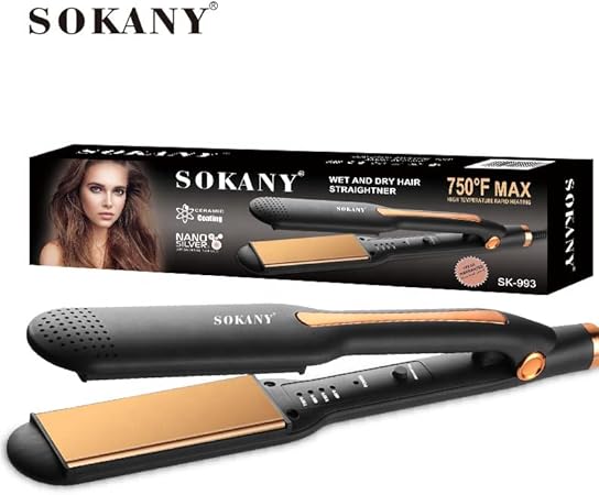 The image features the Sokany SK-993 Wet and Dry Hair Straightener, showcasing its design and key features. The hair straightener is black with gold-colored plates and accents, with “SOKANY” printed on the handle. It is displayed alongside its packaging, which highlights the “750 F MAX” temperature setting, nano silver technology, and suitability for both wet and dry hair. The packaging also features an image of the product in use and the model number “SK-993
