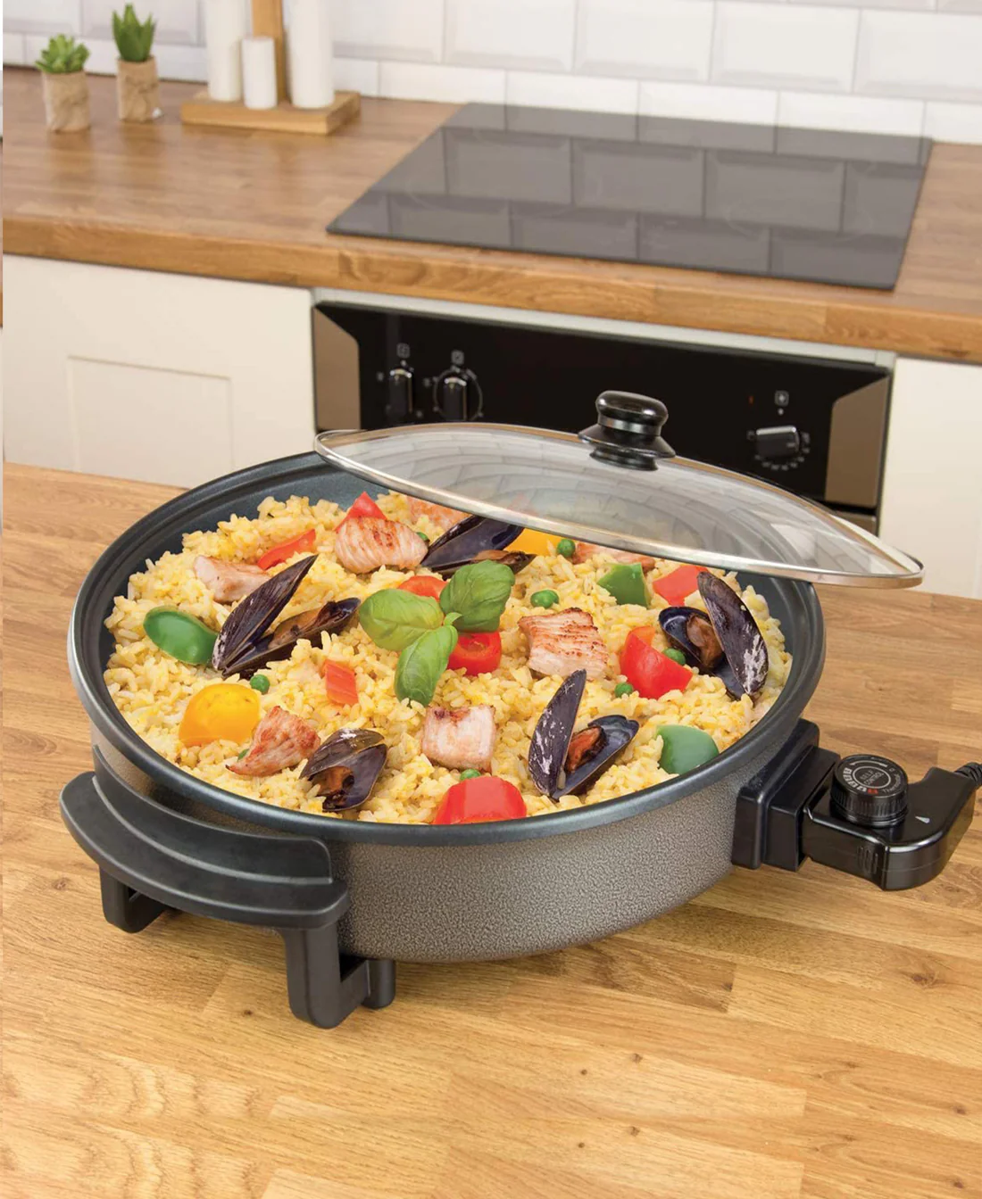 – Large glass lid with cool-touch knob and steam vent